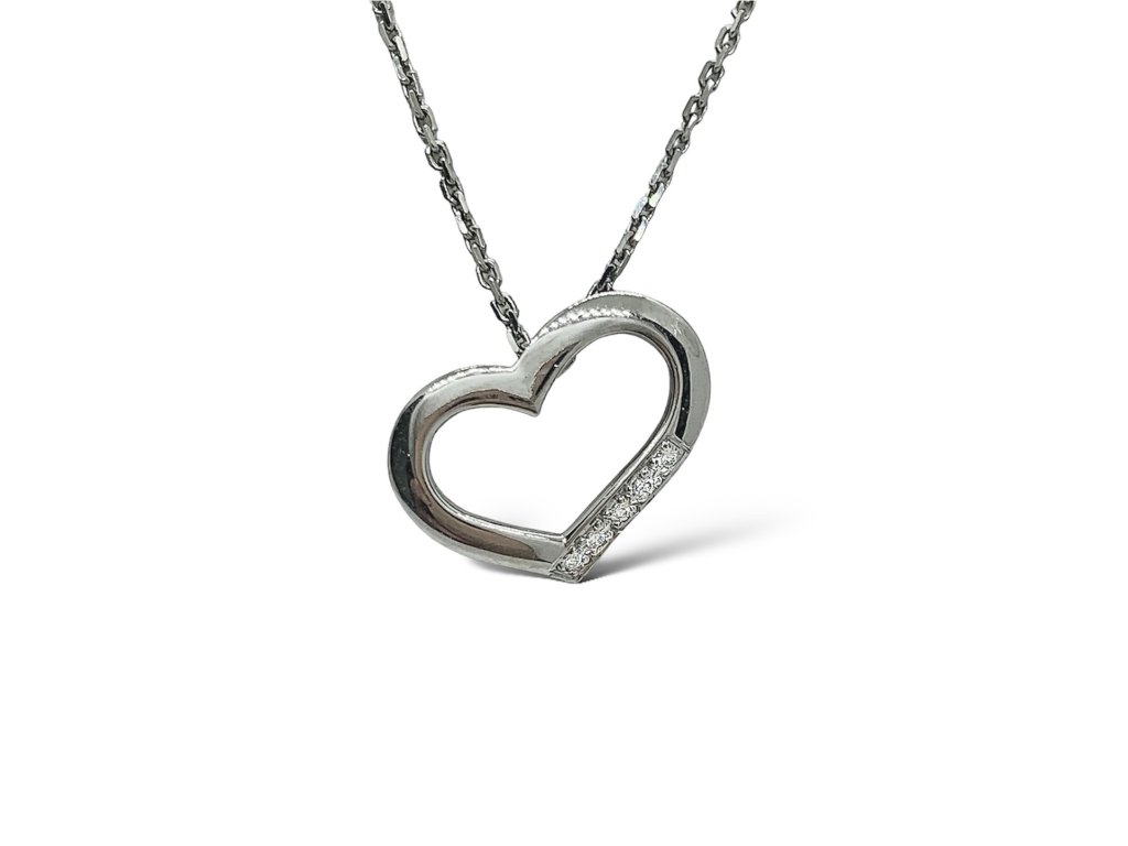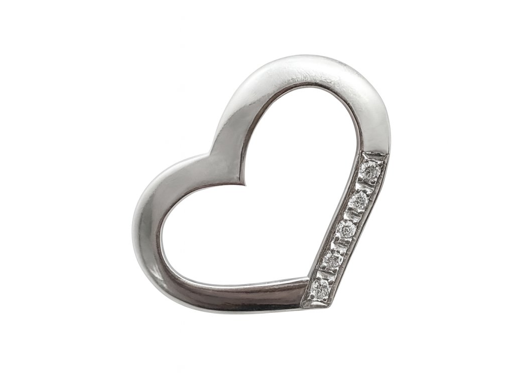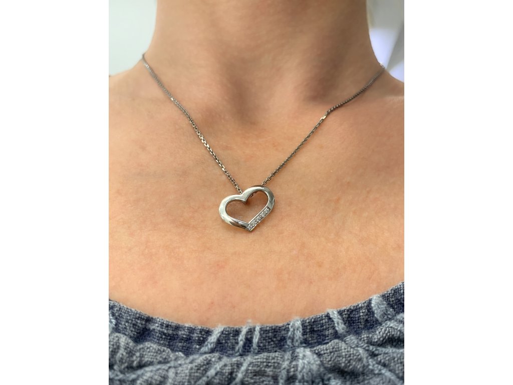 Dámský přívěs z bílého zlata. Přívěs ve tvaru srdíčka je zdobený drobnými moissanity. Řetízek v délce 42 až 45 cm je součástí přívěsku.