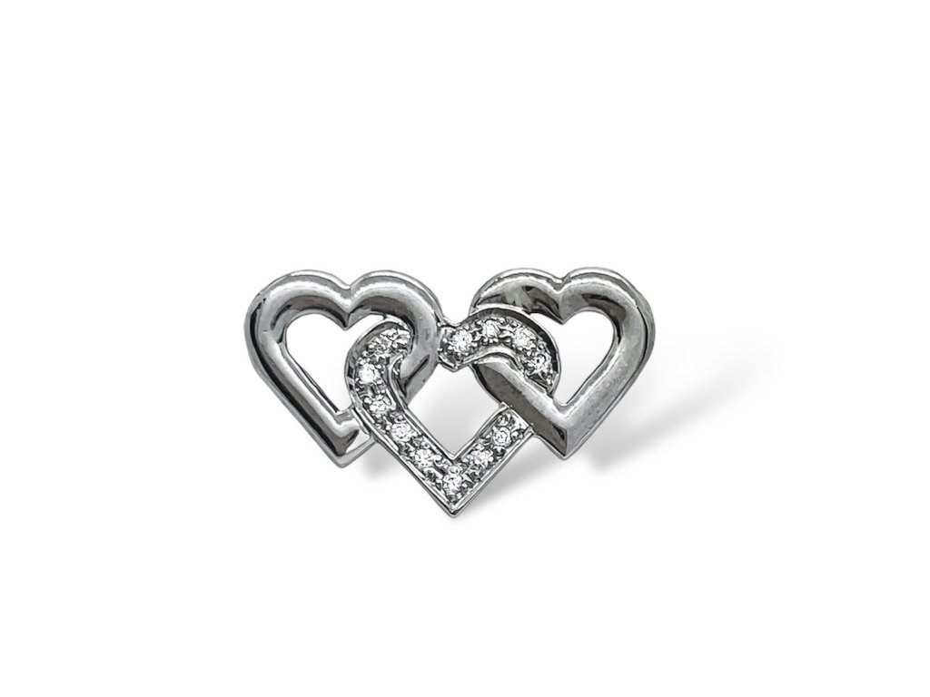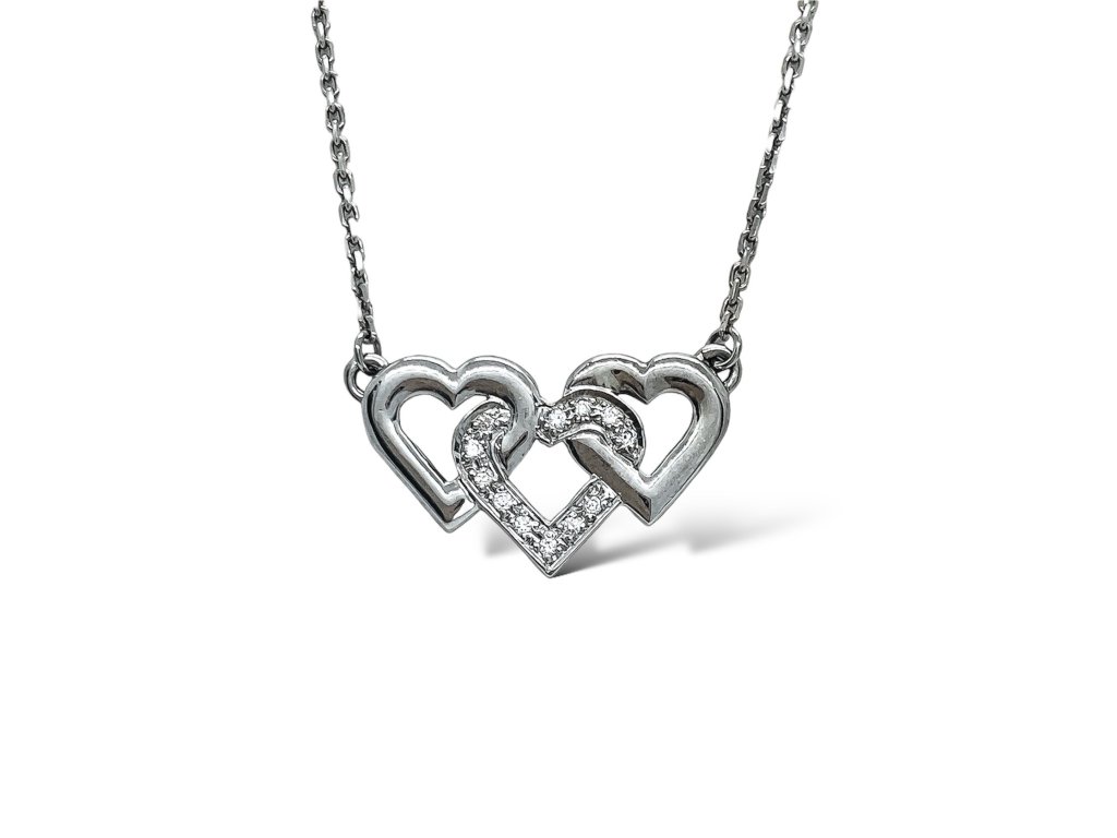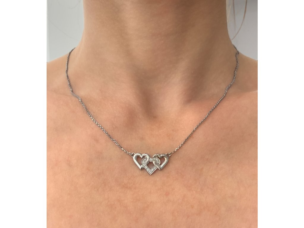 Dámský přívěs z bílého zlata. Přívěs ve tvaru tří propletených srdíček. Prostřední srdíčko zdobí drobné moissanity. Řetízek v délce 42 až 45 cm je součástí přívěsku.