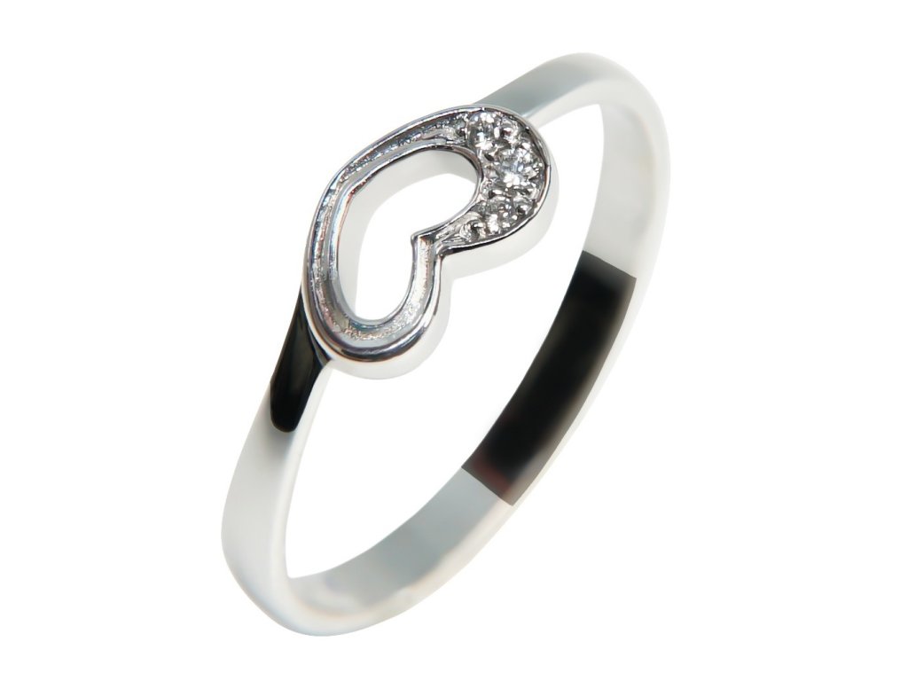 Krásný prsten z bílého zlata ve tvaru srdíčka, zdobený třemi brilianty.