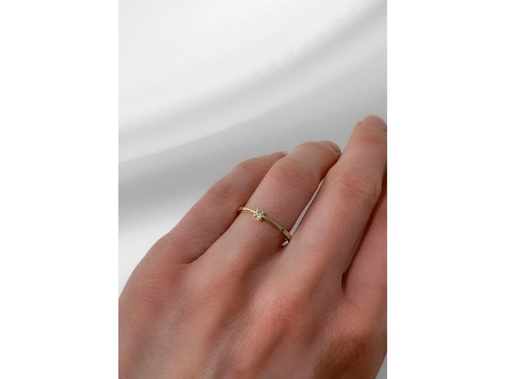 Jemný zásnubní prstýnek ze žlutého zlata zdobený moissanitem. Prsten je velice oblíbený pro svoji jednoduchost.