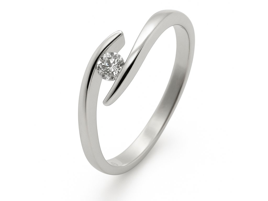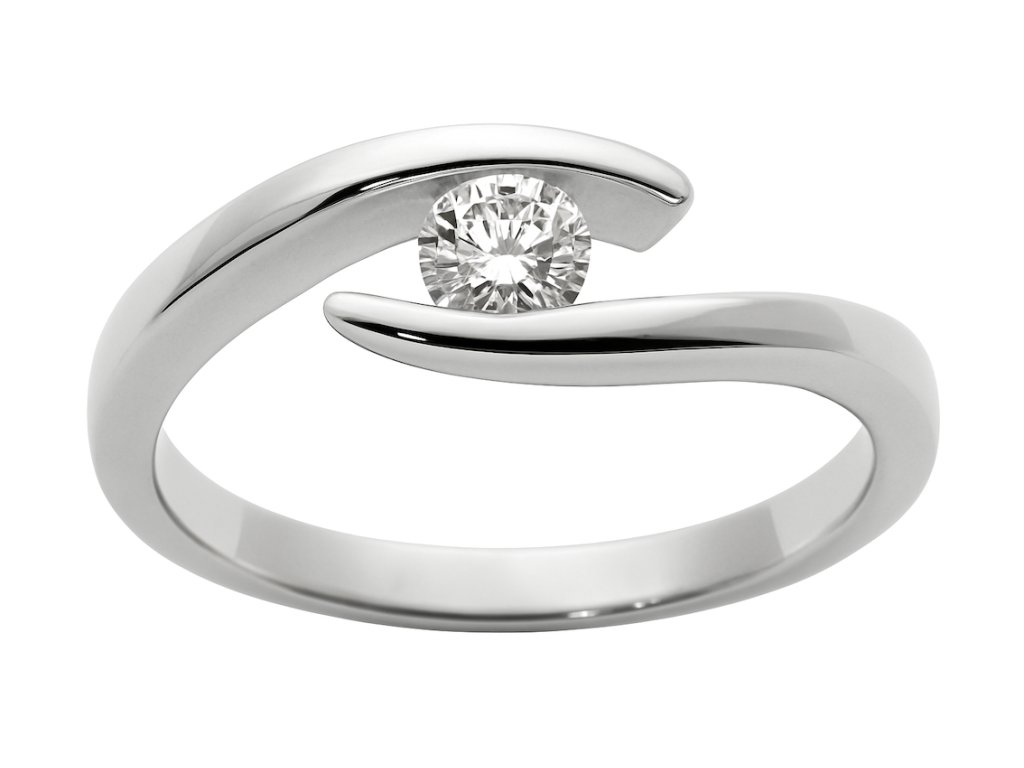 Krásný zásnubní prstýnek z bílého zlata zdobený moissanitem.