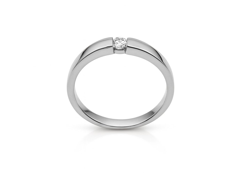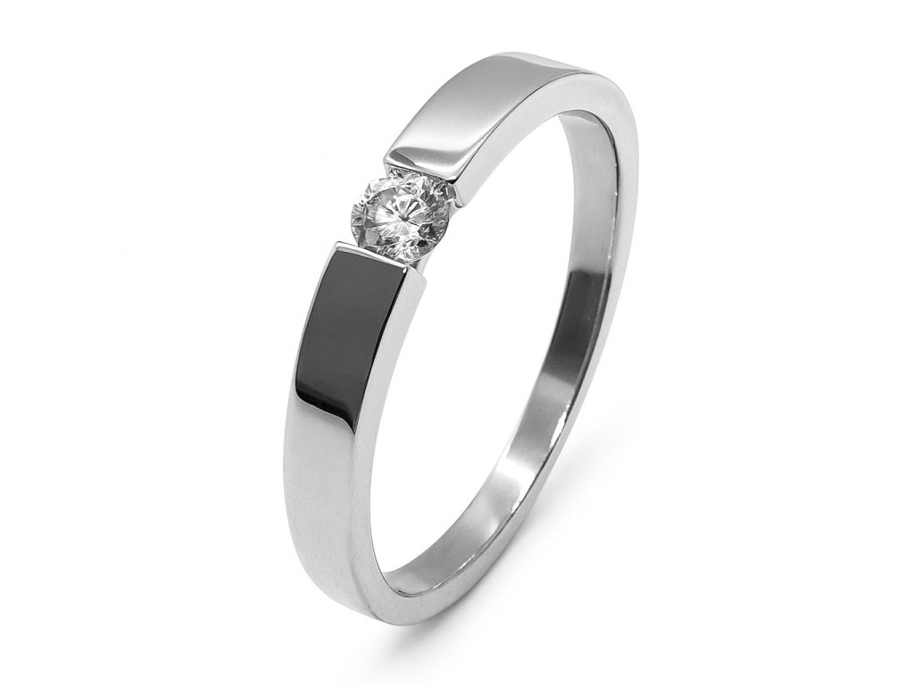 Krásný zásnubní prstýnek z bílého zlata AU 585/1000 zdobený moissanitem. Prsten je oblíbený pro svoji jednoduchost.