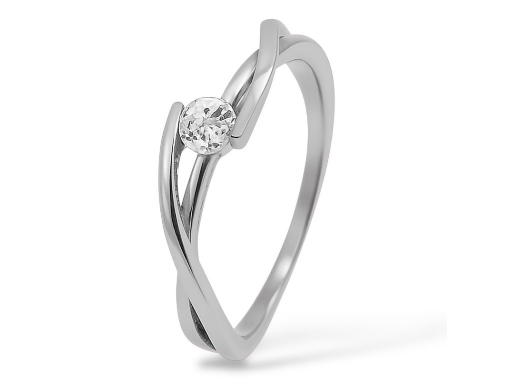 Zásnubní prsten z bílého zlata zdobený moissanitem.