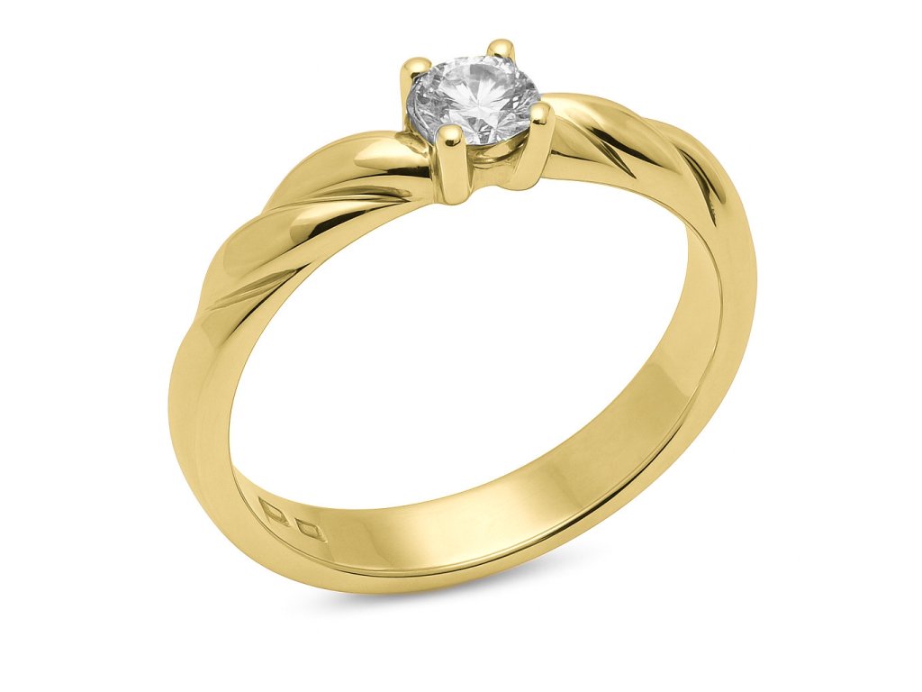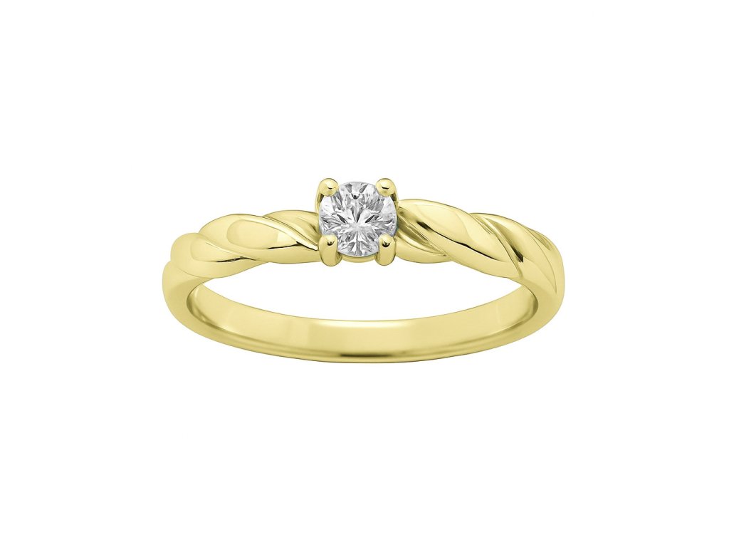 Krásný zásnubní prstýnek ze žlutého zlata. Prsten zdobí jeden centrální moissanit.