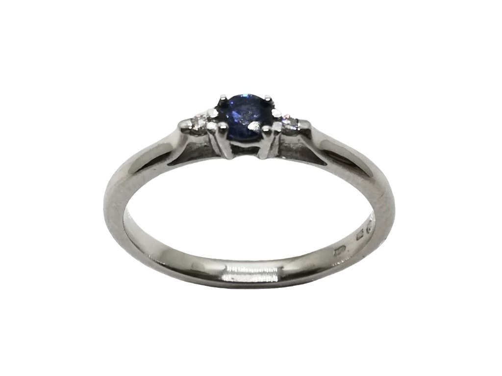 Zásnubní prsten z bílého zlata se safírem a brilianty