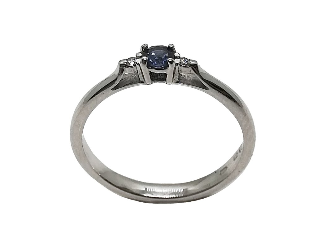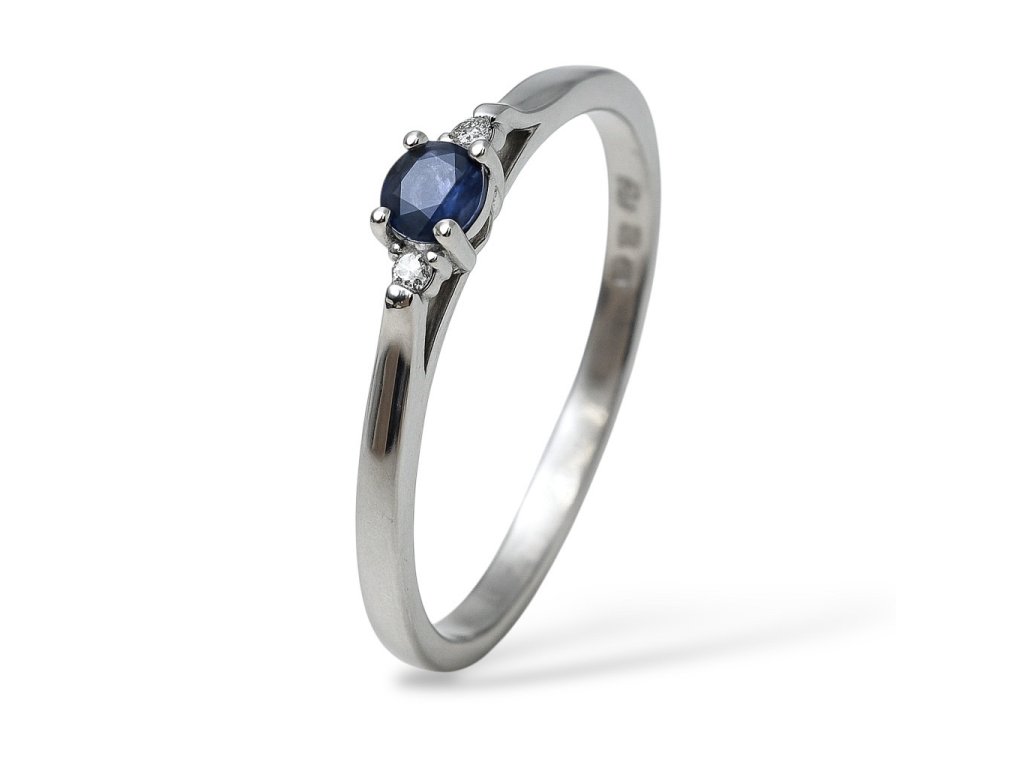 Jemný zásnubní prstýnek z bílého zlata AU 585/1000 zdobený brilianty a přírodním safírem. Prsten je velice oblíbený pro svoji jednoduchost.